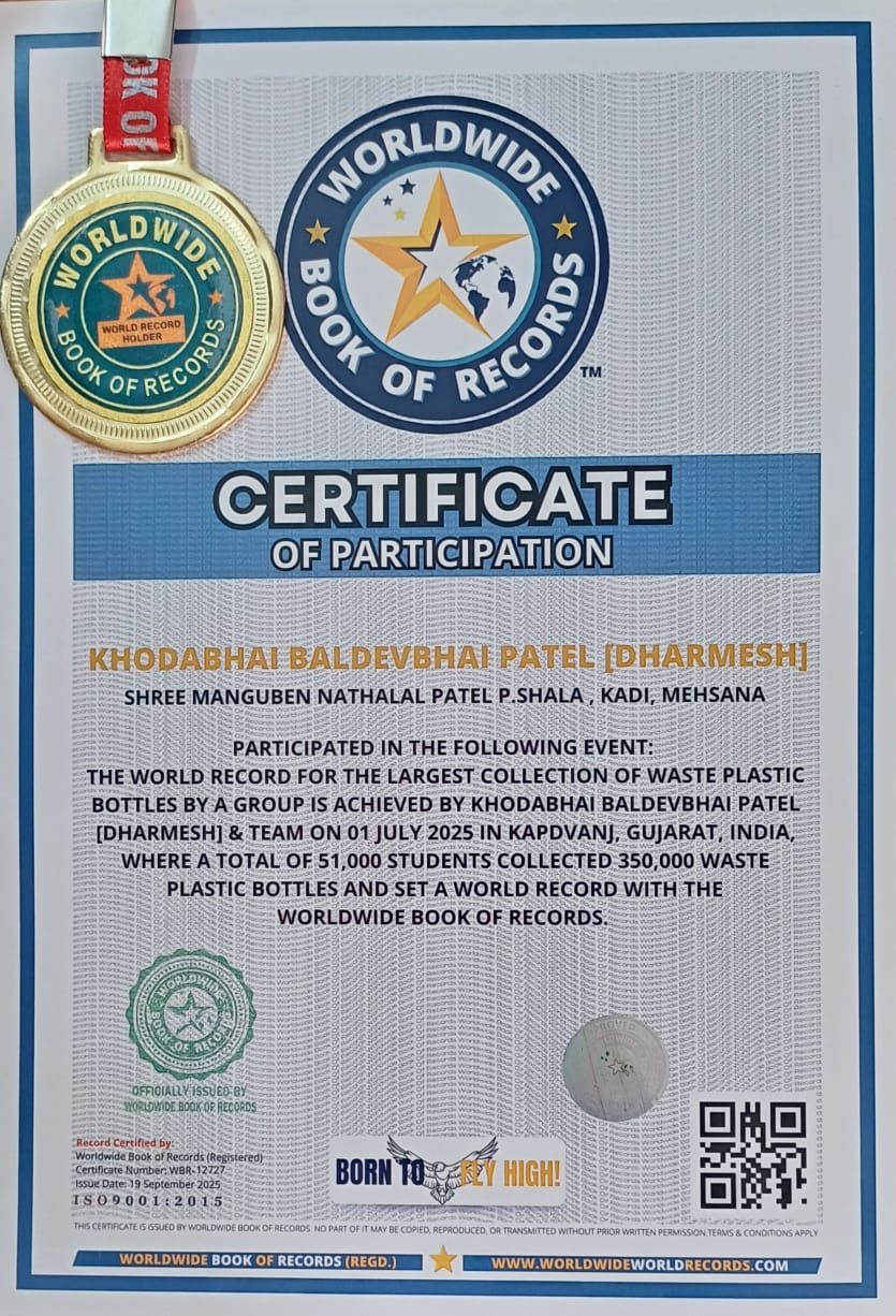 કડી તાલુકાના નાનીકડી વિસ્તારમાં આવેલી શ્રી મંગુબેન નાથાલાલ પટેલ પ્રાથમિક શાળાએ પર્યાવરણ સંરક્ષણ ક્ષેત્રે એક ઐતિહાસિક સિદ્ધિ હાંસલ કરી છે. શાળાના પર્યાવરણપ્રેમી આચાર્ય ખોડાભાઈ બળદેવભાઈ પટેલ ‘ધર્મેશ’ વિડજવાળાના માર્ગદર્શન હેઠળ ચલાવવામાં આવેલા પ્લાસ્ટિક મુક્ત શાળા અભિયાનને વૈશ્વિક સ્તરે માન્યતા મળી છે અને શાળાનું નામ વર્લ્ડ વાઈડ બુક ઑફ રેકોર્ડ્સમાં નોંધાયું છે. આ ખાસ સિદ્ધિ માત્ર શાળાના જ નહીં પરંતુ સમગ્ર કડી તાલુકા અને ગુજરાતના શિક્ષણક્ષેત્રના ગૌરવમાં વધારો કરતી ઘટન તરીકે જોવામાં આવી રહી છે.