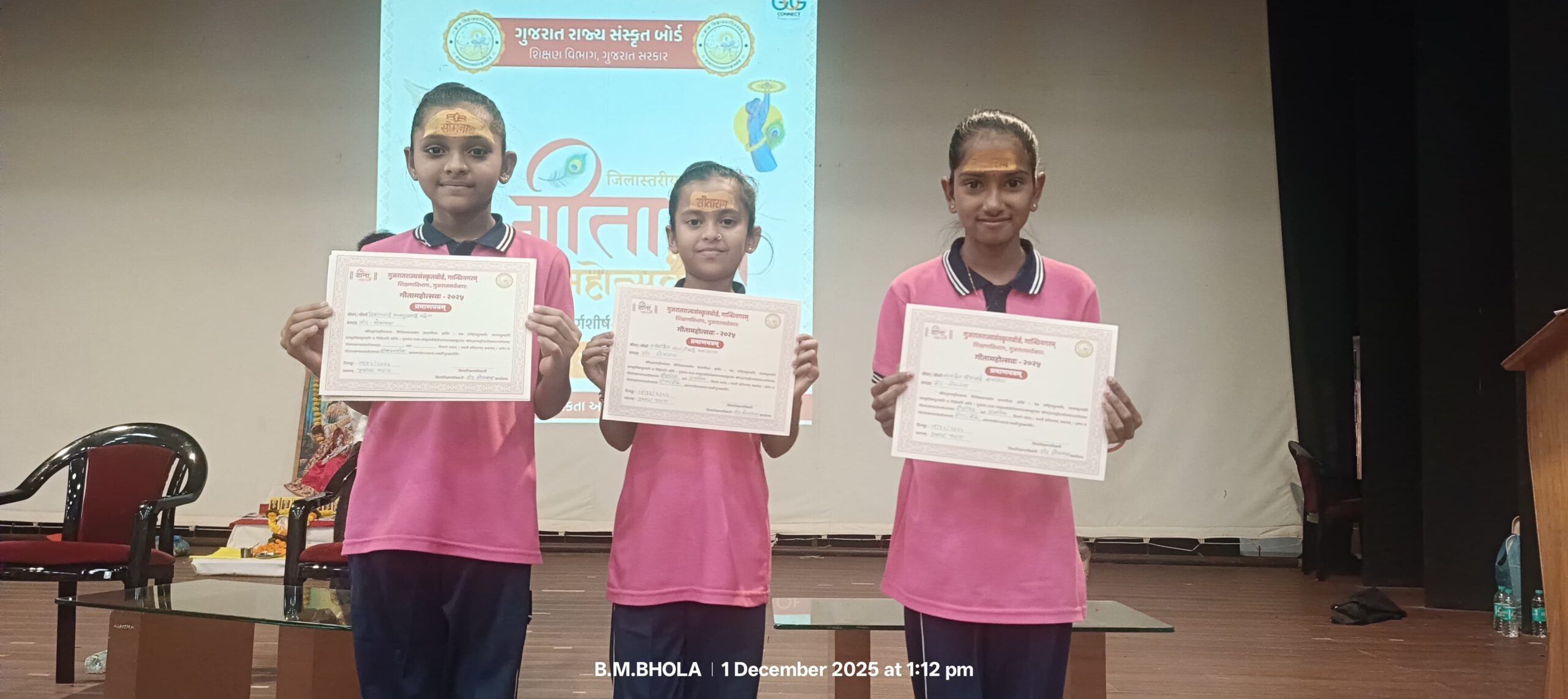 આંકોલવાડી કન્યાશાળાની બાલિકાઓ ઉર્વશી મકવાણા, ટ્વિંકલ મકવાણા, કાંતા બાંભણીયા અને શાળાના શિક્ષક શ્રી નિશાંતભાઈ મહેતાને જીલ્લાકક્ષાએ આયોજિત ગીતાંશ કંઠપાઠ કાર્યક્રમમાં તેમની શ્રેષ્ઠ કામગીરી માટે પ્રમાણપત્ર એનાયત કરવામાં આવ્યા.