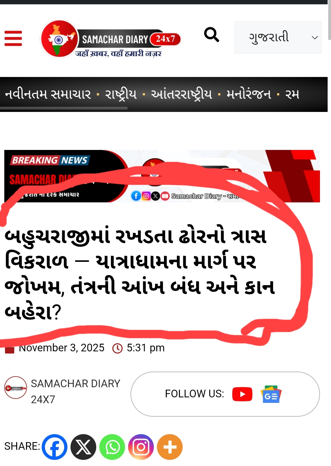 સમાચાર ડાયરીએ બહુચરાજીમાં રખડતા ઢોર બાબતે ચેતવ્યા છતાં તંત્ર ઊંઘતું ઝડપાયું — રખડતા ઢોરે લીધો યુવાનનો જીવ,મહિલા માંડ માંડ બચી November 29, 2025 No Comments